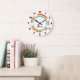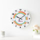 Este relógio divertido apresenta um arco-íris vibrante que forma uma moldura circular para um nome personalizável, acentuado por nuvens fofas e estrelas douradas.