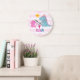"Raio". Um visual doce e brincalhão de uma linda, ousada, kawaii, brontosaurus e cena t-rex e uma tipografia manuscrita sobre uma rosa claro e um fundo listrado branco adoram esse relógio amável, branco, de creche de bebê. Escolha de forma quadrada ou redonda, cinzas ou mãos de relógio preto. Excelente para o berçário do bebê. Faz um lindo novo bebê, um presente de chá de fraldas ou um presente de aniversário para uma criança!