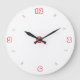 Um relógio de parede de cozinha branco fresco muito simples com números vermelhos em fonte geométrica x.