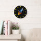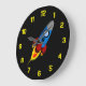 Foguete azul e vermelho com uma cinza nosecona e um proletol grande, com chamas amarelas e vermelhas sendo disparadas de três motores a jato. Um relógio de parede único e divertido!