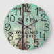 Um belo, único, design personalizado de um tipo personalizado apresenta um preto personalizado seus nomes em um design de sobreposição de fontes de script e o sobrenome e ano estabelecidos em um roteiro em negrito com um fundo de madeira azul em apuros. Personalize este relógio adicionando suas informações pessoais. Faz um excelente de casamento, aniversário ou presente de inauguração. Clique em "personalizar este modelo" para alterar os nomes, as fontes e as cores para criar um design único de um tipo. Que acessório elegante e rústico para sua sala de estar, quarto ou sala de família. Se precisar de ajuda para personalizar, envie-me um e-mail para o site @gmail.com. Obrigados para parar em www.zazzle.com/Personal_Creations. ©Karen Hall para Personal_Creations no Zazzle.