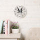 Monogrammed wall clock with a dark brown wood texture background. Personalize the family clock with your family name and monogram initial letter.