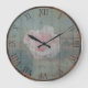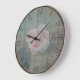 Adicione a aparência de um relógio antigo à sua casa. A imagem contém uma rosa rosa-rosa pintada, latas de metal enferrujadas, algarismos romanos levantados e uma borda biselada (tudo desenhado digitalmente para se parecer dimensional em uma imagem plana). Procure este relógio em um design quadrado também.
