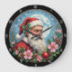 Este lindo gráfico circular apresenta um Papai Noel com aparência clássica, com uma barba branca longa e um traje vermelho. O retrato é colocado contra um céu noturno estrelado com uma lua de cheio grande e brilhante. A borda festiva é feita de flores rosa, bagas vermelhas ocas, e cones de pinho, dando a todo o design uma sensação quente e elegante de feriado.