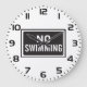 Mantenha o tempo com uma reviravolta usando este relógio de parede com um sinal de aviso em negrito sem natação em preto e branco de alto contraste. Ideal para casas de praia, decoração ao lado da popa, ou adicionar uma peça de declaração única a qualquer sala. Funcional e atraente, combina humor com a prática diária.