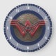 Veja este símbolo gravado de Mulher Maravilha em vermelho, colocado sobre um disco de círculos concêntricos de ouro.