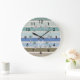 Adicione um detalhe de decoração adicional, assim como uma conveniência de bateria para sua casa de praia, camper RV ou sala costeira estilada com este relógio de faixa de praia. Criado na calmação de uma paleta subjugada de blues marinhos e lacrimejantes, cinzentos e bronzes com um monograma personalizado. Uma coroa de sotaques estrelados completa a sensação. Sua escolha de quadrado ou redondo. Veja mais nesta coleção de design "Beach Stripes and Starfish" em Camp_and_Cottage no Zazzle.