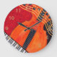 Funcionarios de música e notas flutuam acima de um violoncelo e piano em intensos vermelhos e dourados. O teclado se destaca em contraste com as cores e o fundo escuro.