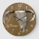 If you love Texas, this clock is for you! Featuring a single Texan horned cow skull on a stucco wall...just "hanging around" in the hot Texas sun. Text says simply "TEXAS" and can be customized.