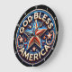 Este relógio circular apresenta um design ousado e patriótico com uma proeminente estrela de efeito 3D em seu centro. A estrela é vermelha, branca e azul, com estrelas menores ao seu redor. As palavras "DEUS ABENÇOE" são guardadas acima, e "AMÉRICA" é curvada abaixo, ambas em letras fortes e dimensionais. O design inteiro está definido dentro de um ouro, com marcas. Relógio circular com um design patriótico americano com um motivo estelar e texto "América Deus abençoe" em negrito. Perfeito por expressar orgulho nacional em casa ou no escritório.
