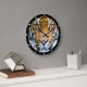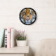 O relógio de parede com uma fotografia de perto do rosto de um belo tigre, com listras laranja, pretas e brancas dramáticas. Diversão de decoração com o tema safari.