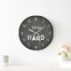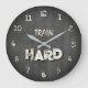 This bold Train Hard wall clock features a dark concrete style background that brings an industrial gym atmosphere into your space. The textured grey surface combined with elegant ivory numbers and typography creates a strong yet clean fitness-inspired design.