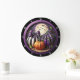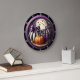 Esta ilustração única do Dia das Bruxas apresenta um quadro circular com três abóboras sob uma lua de cheio brilhante com morcegos voando. As abóboras incluem uma listrada preta e branca com um arco roxo grande, uma púrpura verde e uma abóbora laranja clássica. A cena tem uma sensação assustadora, mas encantadora.