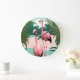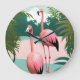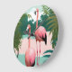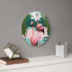 Uma cena serena de dois flamingos cor-de-rosa parados por um litoral tropical, rodeado por uma folhagem verde vibrante e tons pastéis macios. Perfeito por adicionar um toque de beleza exótica a qualquer espaço.