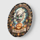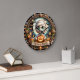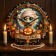 Este relógio festivo do Halloween apresenta uma múmia adorável com olhos grandes e verdes, segurando uma luva brilhante. A múmia está cercada por casas assustadoras assombradas, abóboras menores, e uma lua cheio escura com morcegos voando sobre ela. Um banner na parte inferior da face do relógio lê "TRICK OR TREAT". Toda a design está fechada dentro de uma ornamentado, borda escura com teias de aranha e decorações estilizadas.