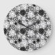 Two images show a round wall clock with a black and white pattern of various clock faces and gears. The first image is a front view; the second shows an angled view.