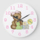 Este pulso de disparo bonito do bebé, é um presente perfeito para mãe-à-estar. Caracteriza um urso do bebê dos desenhos animados em um arco cor-de-rosa grande, e em torno dela são blocos de apartamentos de "ABC", um pato verde do brinquedo, e um chocalho do bebê. As cores são pastels verdes, cor-de-rosa, amarelos, e azuis. Este pulso de disparo é perfeito para a sala de crianças, e vem em três tamanhos, um deles quadrados. Os números neste pulso de disparo são uma cor cor-de-rosa de harmonização, e fáceis de ler.