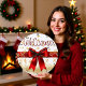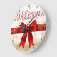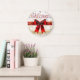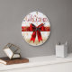 This stunning clock features the word "Welcome" in sweeping red script over a brilliant white background covered in gold snowflakes. A large, luscious red satin bow with gold trim sits prominently at the center, resting on a thick red horizontal band. The design is highly festive, elegant, and uses copious amounts of shimmering gold glitter. The design may look real due to the high detail and three-dimensional texture in the artwork.
