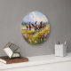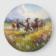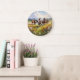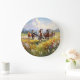 A lovely wall clock, your choice of small or large round styles, making a terrific gift idea for cowgirls, cowboys and western art lovers, a gorgeous painting of wild horses running in a grassy field of wildflowers