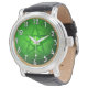 Este relógio apresenta o pentáculo verde do norte, que representa o elemento terrestre, sobre um fundo de pedra texturizado. Os números são grandes e brancos para uma visualização fácil.