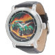 This bold watch face features a vintage-style green hot rod car, its lower half surrounded by intense orange and red flames, appearing to race on a dark road. The background includes dark, stormy-looking clouds that blend with the fiery hues, creating a dramatic and powerful scene for automotive enthusiasts.