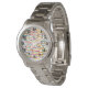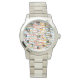 Este relógio feminino tem uma design moderna do século médio de rabiscos correndo verticalmente em cores retrógradas com estrelas pretas e círculos espalhados sobre a design.