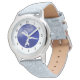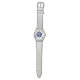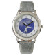 Qualquer garota que ama ginástica vai adorar este relógio! Ele apresenta um ginasta prateado em um movimento de mão no centro. Acima da figura está um spray de poeira prateada. As imagens são colocadas sobre um fundo azul real. Os números colocados num círculo exterior branco facilitam a leitura do relógio.