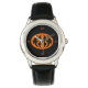 Este incrível relógio apresenta um oval laranja com seis corvos. Cada corvo tem olhos amarelos com pupilas pretas e asas salientes. Os corvos voam em direção uns aos outros formando uma forma oval. O fundo é preto.