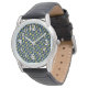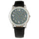 Este relógio masculino tem um médio de ovais moderno século design em marinho com semicírculos em tons de amarelo e sombras de cinza em um campo de preto.