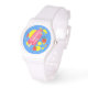 Um relógio com um tema de verão. Concebidos com um picolé cor-de-rosa e alguns morangos vermelhos e plasmas de tinta amarela. Fundo azul.