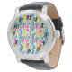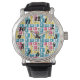 Este relógio masculino tem uma design moderna do século médio de retângulos arredondados, alguns dos quais são anexados e alguns deles têm estornamentos, em cores retrógradas de vermelho, ouro, verde e turquesa. Se você gosta do design, mas prefere cores diferentes, me mande mensagem.