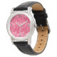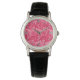 Assista em um Art Nouveau, cor damasco Jacoba de folhas e flores estilizadas e roladas, baseado em uma safra têxtil William Morris, melhorada digitalmente e colorida em tons de rosa fuchsia médio a profundo, com fundo rosado pastel