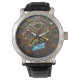 Única Jazz Music Watch, que apresenta saxofone, trompete e luz de neon azul com "jazz" definido dentro do motivo industrial/steampunk com engrenagens e engrenagens em ouro com diamantes, pedras rubis. Cuidado fabuloso para músicos, patrocinadores do clube de jazz, músicos e fãs de música.