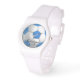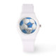 Um relógio de bola azul e branca para uma jogadora de futebol feminino, com um lugar para o seu nome em guião preto. Este é o presente personalizado perfeito para uma jovem ou adolescente. A cor da banda pode ser alterada de rosa para vermelha ou branca, ou mudar completamente a aparência do relógio.