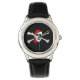 Crianças clássico relógio preto de couro mostrado com um impressão de crânio pirata. Escolha esta monitorização a partir de vários estilos. Personalize este relógio ou comprar como está. Imagem do stock