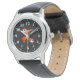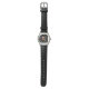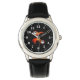Kids classic leather strap watch shown in black with a sporty flaming soccer balls print.
