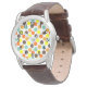 Este relógio masculino tem um design geométrico de pontos azuis, laranja, amarelo e castanho.