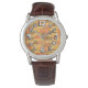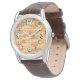 Este relógio masculino tem uma design moderna do século médio de repetição de retângulos em laranja, ouro e marrom com círculos dispostos em cima.