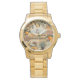 Um relógio de pulso muito elegante com um tema espanhol. A ilustração no rosto do relógio retrata uma paisagem com moinho de vento, junto com laranjas em ramos de folhas, e fãs tradicionais.