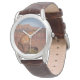 Um clássico relógio de couro marrom mostrado com um impressão de fotos de leões da montanha da natureza selvagem. Escolha esta monitorização a partir de vários estilos. Personalize este relógio ou comprar como está. Imagem do stock