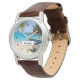 Um relógio personalizado com uma cena de praia tropical idílica. Água clara de cristal azul turquesa e uma praia arenosa castanha macia. Algumas folhas de palma penduradas de cima. Um velho barco a remo de madeira fica sentado na praia. Uma paisagem serena e pacífica.