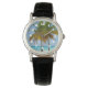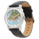 Um relógio com uma bela e tranquila fotografia de duas palmeiras sob um céu azul brilhante. Em pé numa praia tropical isolada com água turquesa calma.
