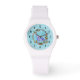 Um relógio com uma ilustração gráfica composta por um lobo de aquarela púrpura, numa pose clássica de uivar. Cercados por uma camada ilustrada de madeira, cristais, penas e miçangas. Legal motif nativo americano com estilo boho.