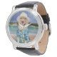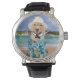 Um relógio com um laboratório amarelo de 90 lb, numa camisa havaiana, numa praia tropical. Quatro posições principais são marcadas por sinais soltos. Esperamos que isso o mantenha animado durante o dia. Você pode mudar as opções de observação. O fundo da praia é um quadro publicitário.