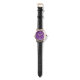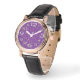 Este relógio feminino tem um design de Mardi Gras geométrico de uma espécie de ovais planas se repetindo através da design em ouro e verde num campo de roxo.