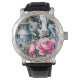 This men's watch is shown with a cute farm cow and pink peony flowers art print.