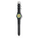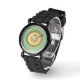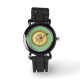 Este incrível relógio apresenta uma imagem gráfica de uma moeda de ouro com dois tons de ouro. O círculo externo tem uma textura áspera. Dentro, o círculo interno da moeda é uma pedra-do-ouro texturizada composta por três folhas e um caule.