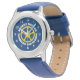 O relógio de criança personalizado com o design crachá do xerife da polícia amarela. Relógios de pulso personalizados para crianças. Ideia exclusiva de presente de aniversário para meninos e meninas. Criar um para o futuro polícia, filho, neto, sobrinho, irmão mais novo, irmão mais novo, filha, neta, primo, amigo, filho, neto, irmãzinha ou irmã mais velha, etc. Dons de temas divertidos para futuros oficiais, policial, guarda de segurança, xerife adjunto ou agente secreto. Também excelente como presente de Natal para os Feriados. Inclui banda azul. Para proteger e servir. Excelente para polícias e jogos de ladrão.