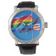 Um relógio clássico com uma bandeira do Orgulho Arco-íris, junto com uma bandeira americana, contra um céu azul perfeito. Celebrando uma América acolhedora e diversificada. Fotografado em Cherry Grove na Ilha Fire. Parte da Coleção do Orgulho.