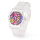 Enlouquecer com este relógio impresso "Febre Selvagem". Este design ousado e na moda é um dos tipos e foi criado de uma pintura abstrato original. Descubra o calor do momento com este acessório colorido e divertido que vai completar sua roupa hoje!
